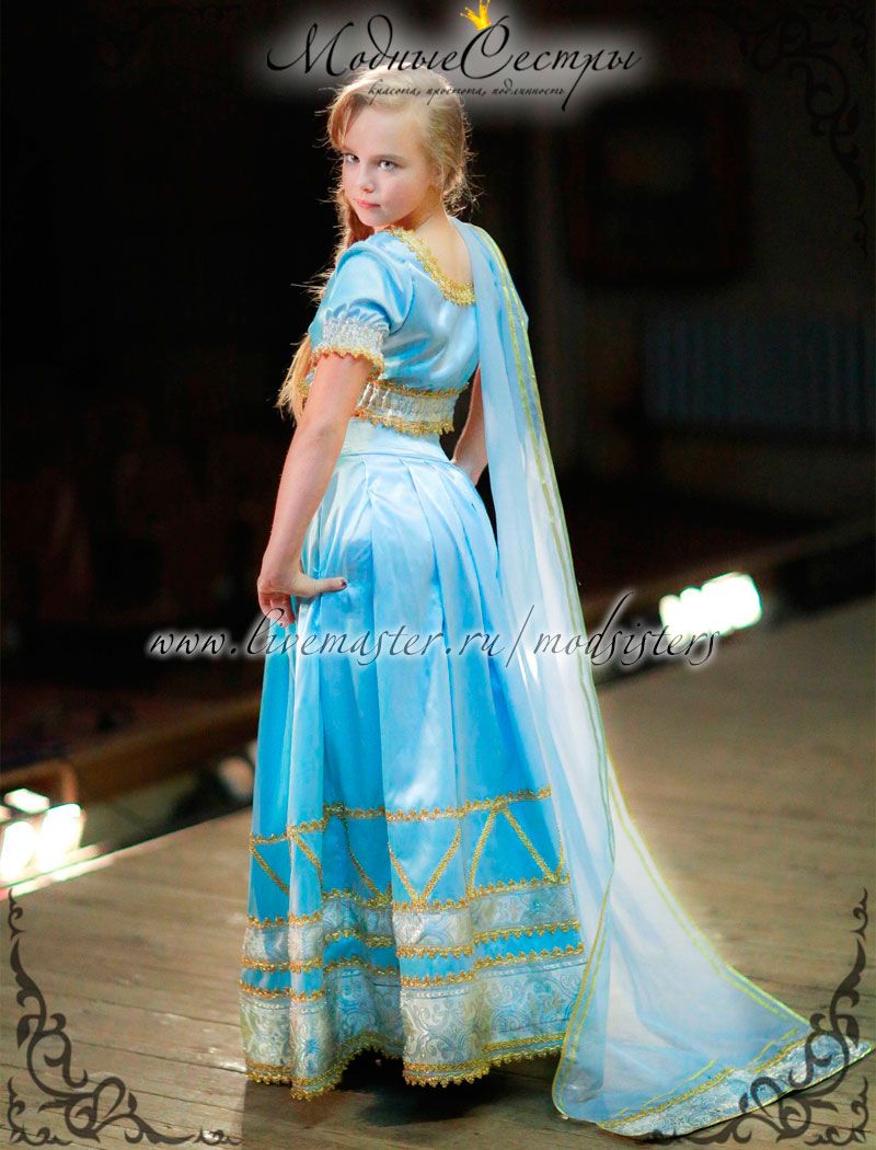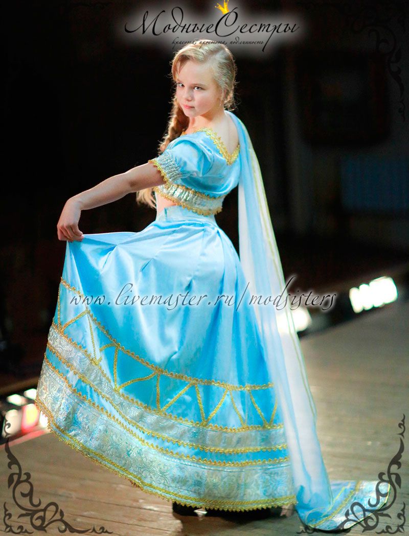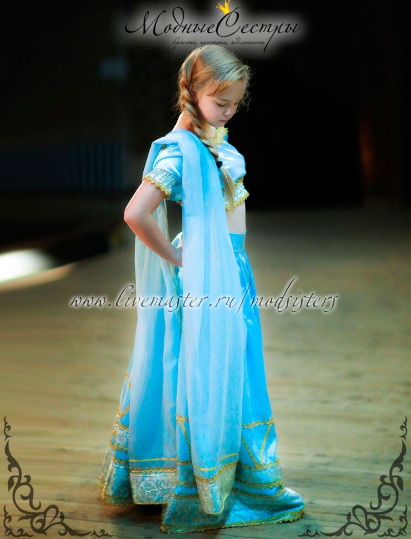 Костюм для девочки пошит как настоящий индийский костюм в Индии. Он состоит из лехенга, чоли и дупатта. Ткань костюма небесно-голубого цвета, с атласным блеском.