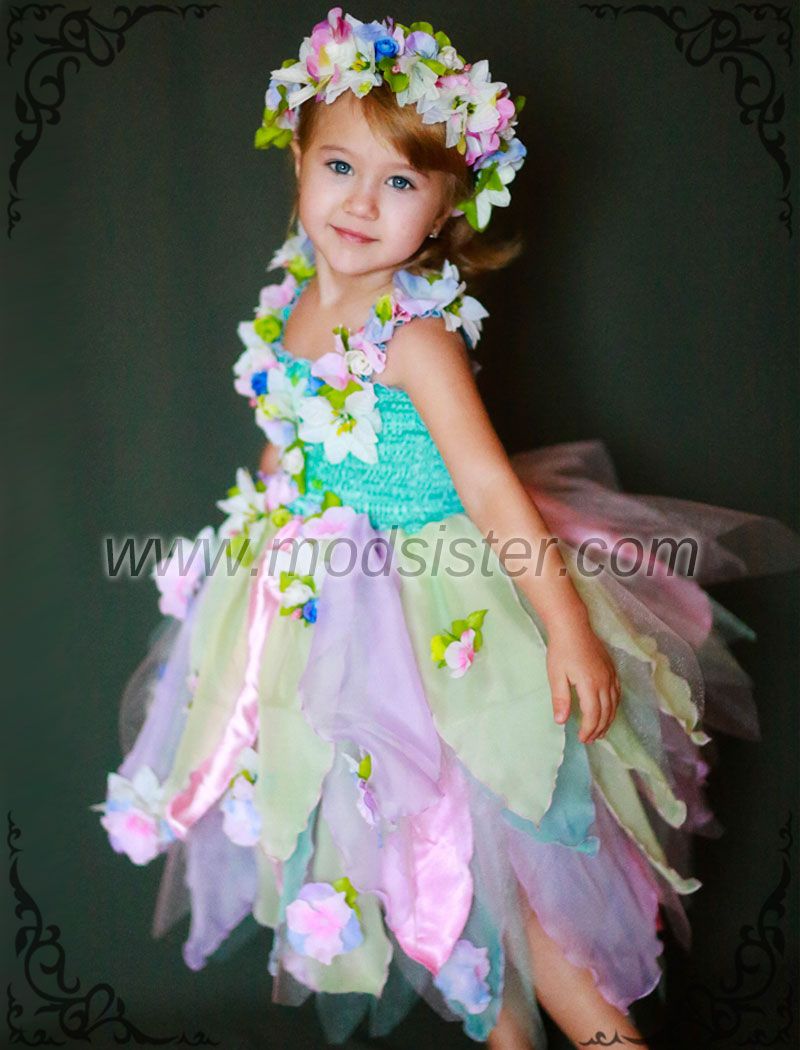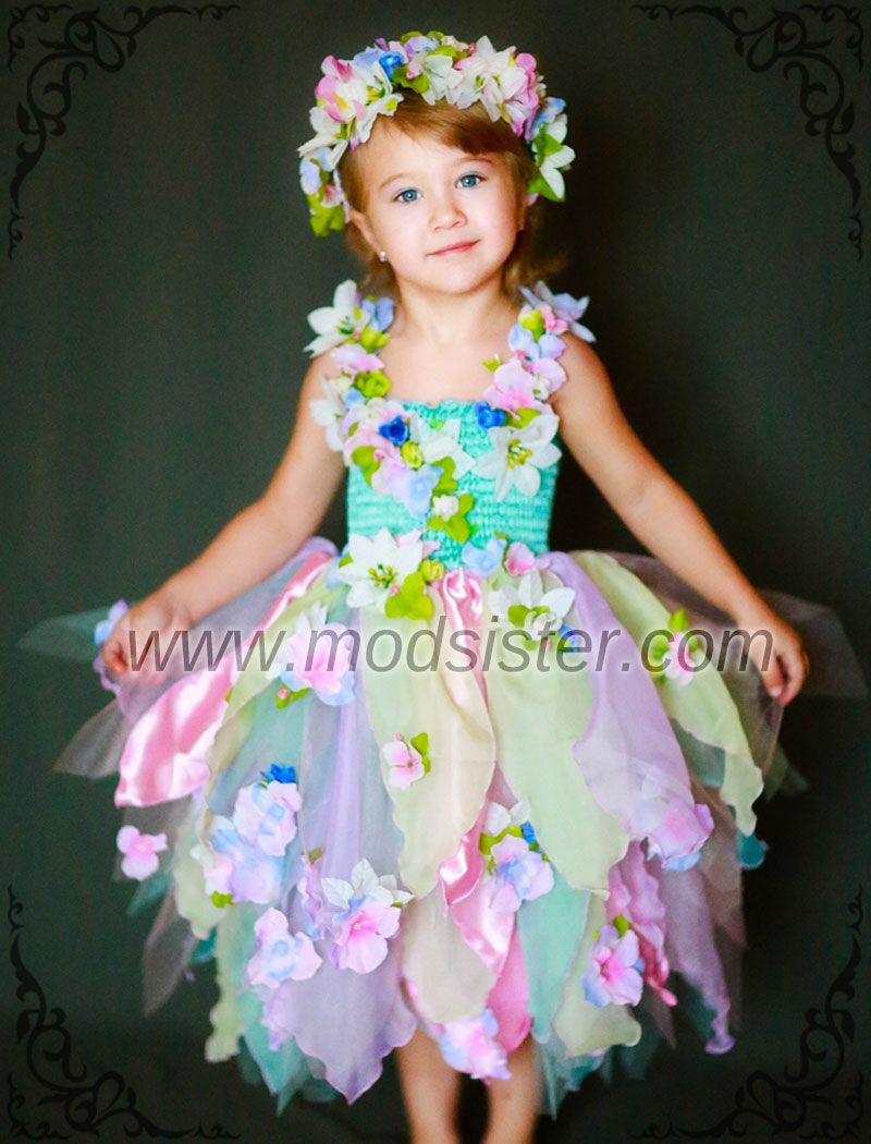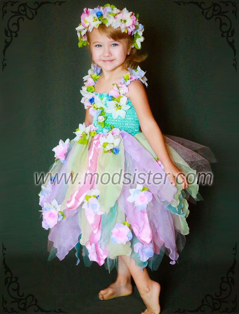 Поистине весеннее платье усыпано нежными цветами. Изящная гирлянда цветов украшает лиф платья. Мелкие цветы кокетливо дополняют юбку. Веночек костюма собран из волшебных весенних цветов.