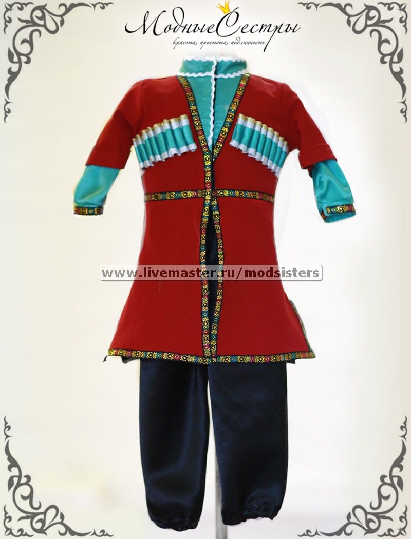 Кафтан-рубашка – цельное изделие, имитирующее небесно-голубую рубашку, одетую под красный кафтан. Такое объединение двух вещей, облегчает переодевание танцора в короткий перерыв между выступлениями. Кафтан, длиной до колена, по линии груди и по краю изделия обработан цветной тесьмой. Длина рукава кафтана – три четверти. Нагрудные карманы под газыри выполнены из рубашечной ткани голубого цвета с белой двухсторонней отделкой. Имитация газырей выполнена золотой тесьмой. Длинный рукав рубашки вшит внутрь рукава кафтана. Край рукава кафтана – прямой. Край рукава рубашки присборен и обшит цветной тесьмой, такой же как и край кафтана. Манишка, пришитая к кафтану, имитирует рубашку с закрытой застежкой и воротником стойкой. Застежка манишки и воротник стойка отделаны узкой тесьмой змейкой белого цвета. Застежка кафтана-рубашки – на липучках.