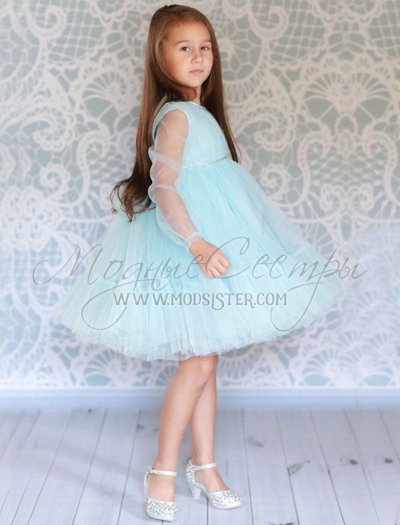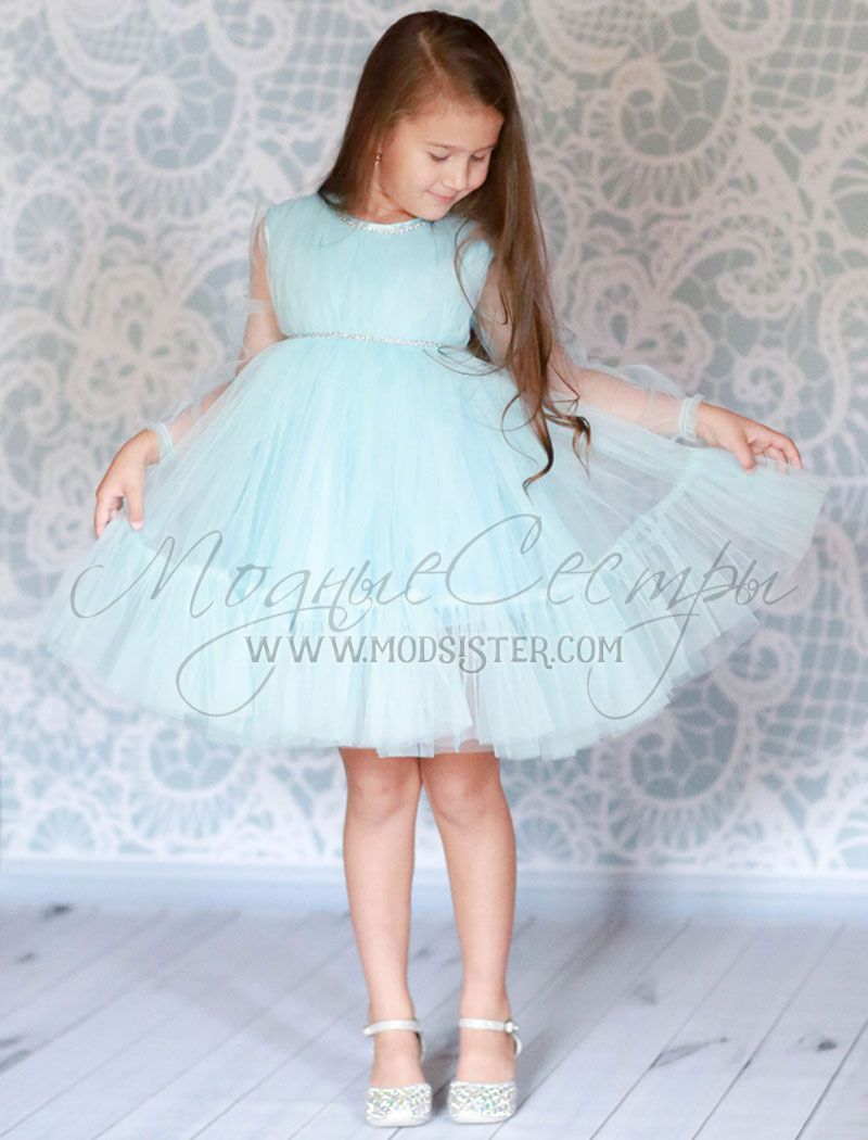 Модель цельнокроеная, расширенная к низу. По пройме платья, все слои ткани сшиты вместе, пройма платья обработана бейкой серебряного цвета. Рукав у платья длинный, пошит из одного слоя прозрачной голубой ткани. Пышная головка рукава присборена, низ прямого рукава собран на двойную резинку. Длина платья – чуть выше колена. По низу юбки пришита широкая оборка.