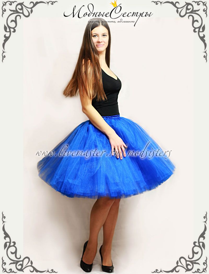 Юбка покроя солнце образует красивые фалды сразу от линии талии. Подъюбник – многослойная, пышная юбка-пачка, пошита из сетки цвета индиго, пояс собран на резинку. Юбка очень мягкая и пышная. Ее можно использовать как самостоятельную деталь гардероба. Юбка хорошо сочетается с облегающими футболками или топами.