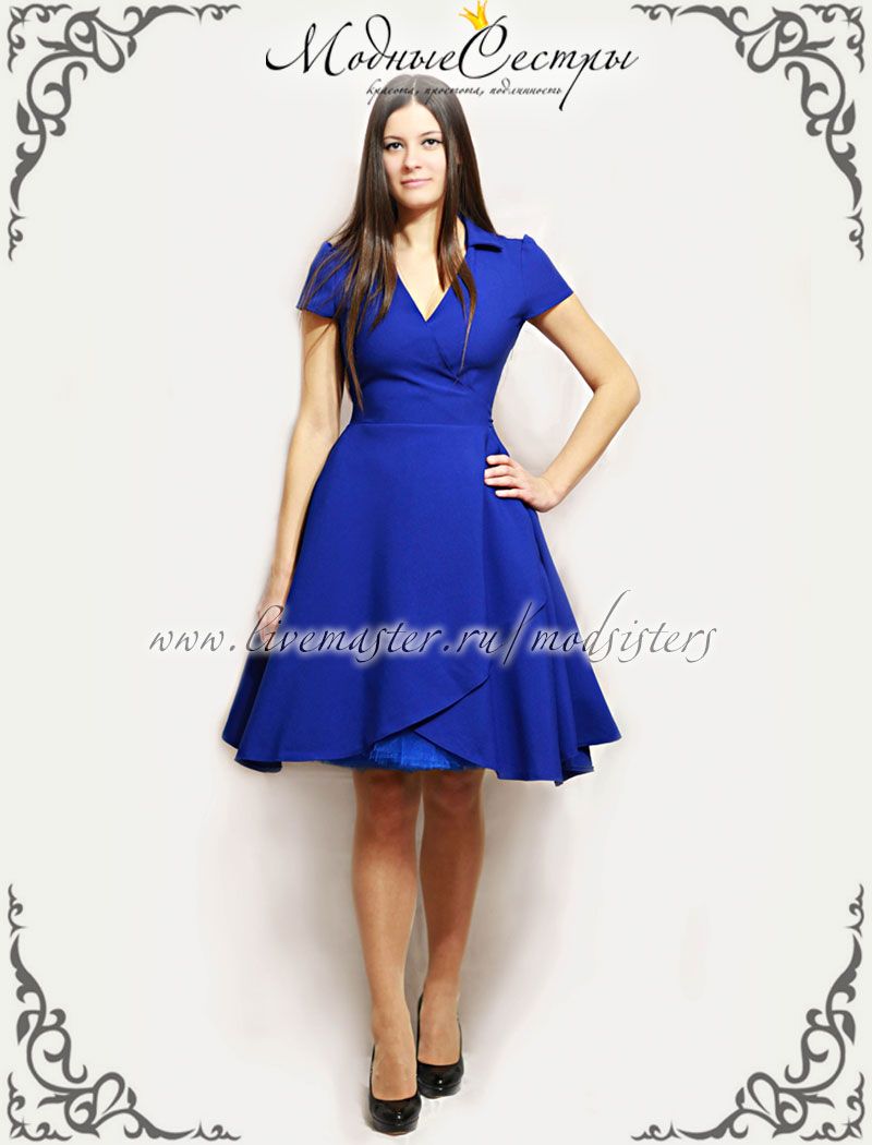 «Модные сестры» представляют свою версию женского платья в стиле стиляг. Оно пошито из яркой ткани цвета индиго. Фасон платья: отрезное по линии талии, с запахом, легкая юбка – воздушная и пышная. Глубокий v-образный вырез украшает небольшой отложной воротник. Короткий втачной облегающий рукав пришел к нам с 50-х годов. Лиф платья плотно облегает фигуру. Пояс фиксирует запах платья и завязывается сзади на талии в большой изящный бант.