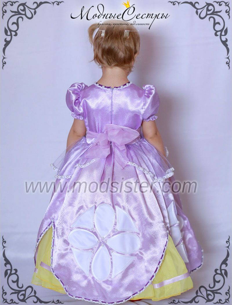 Наши модельеры постарались до мелочей повторить платье принцессы Софии. И лиф, и юбка платья украшены узорами, как у принцессы Софии в мультсериале. Застегивается лиф на застежку молнию, которая вшита на спинке. Короткий нежный рукав фонарик украшен оборкой. По талии пришита нежная прозрачная баска. Низ юбки-колокольчика оформлен в виде четырех лепестков-фестонов. Подъюпник, как облачко, мягкий и пушистый, цвета сливочного пломбира. В боковые швы платья вшит пояс из прозрачной ткани нежно-сиреневого цвета, который завязывается пояс на спине большим бантом.