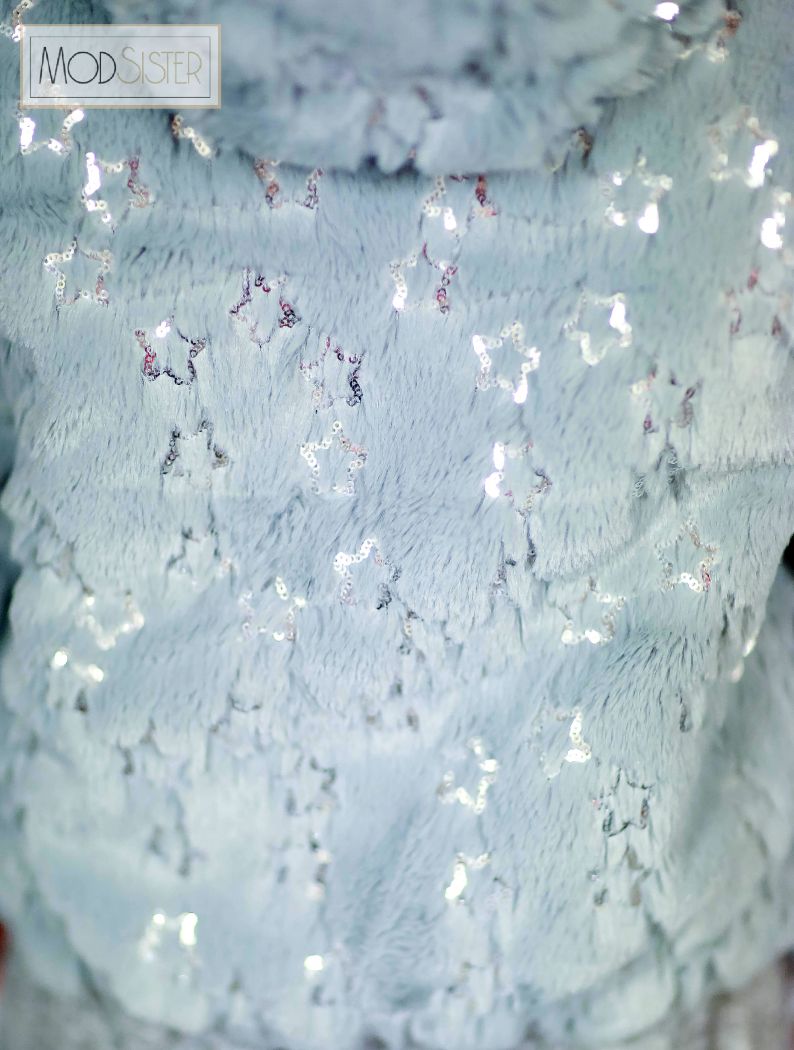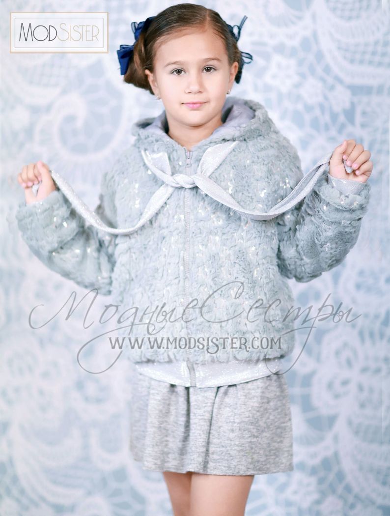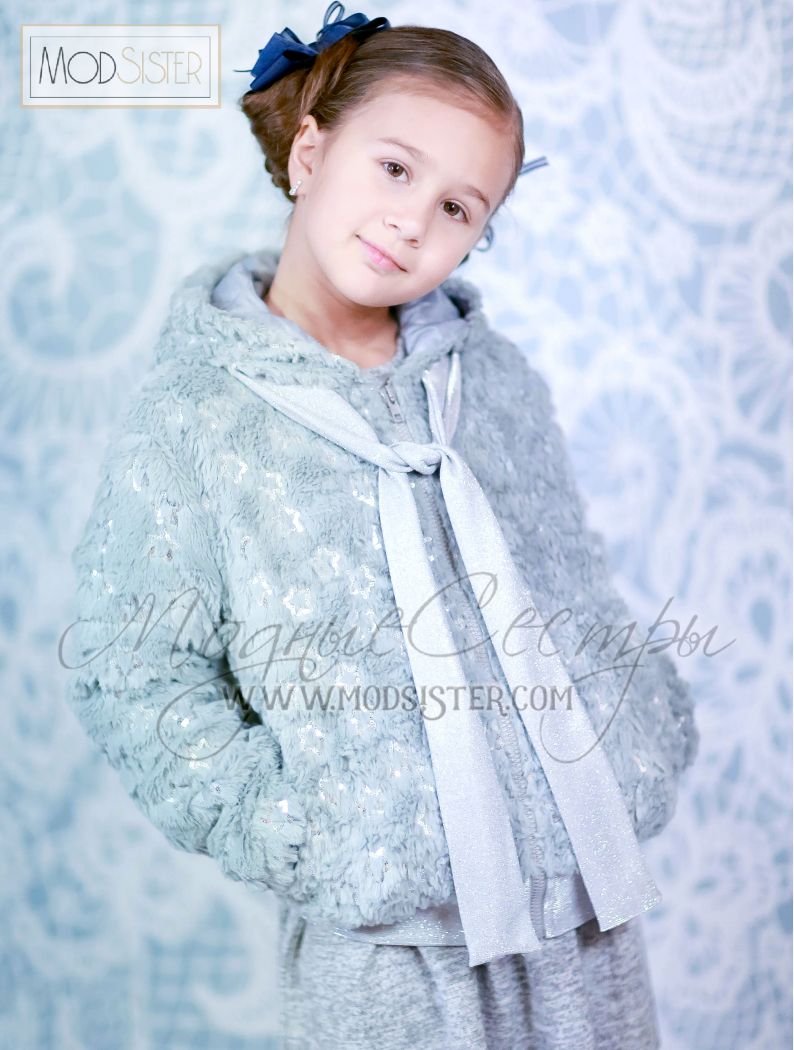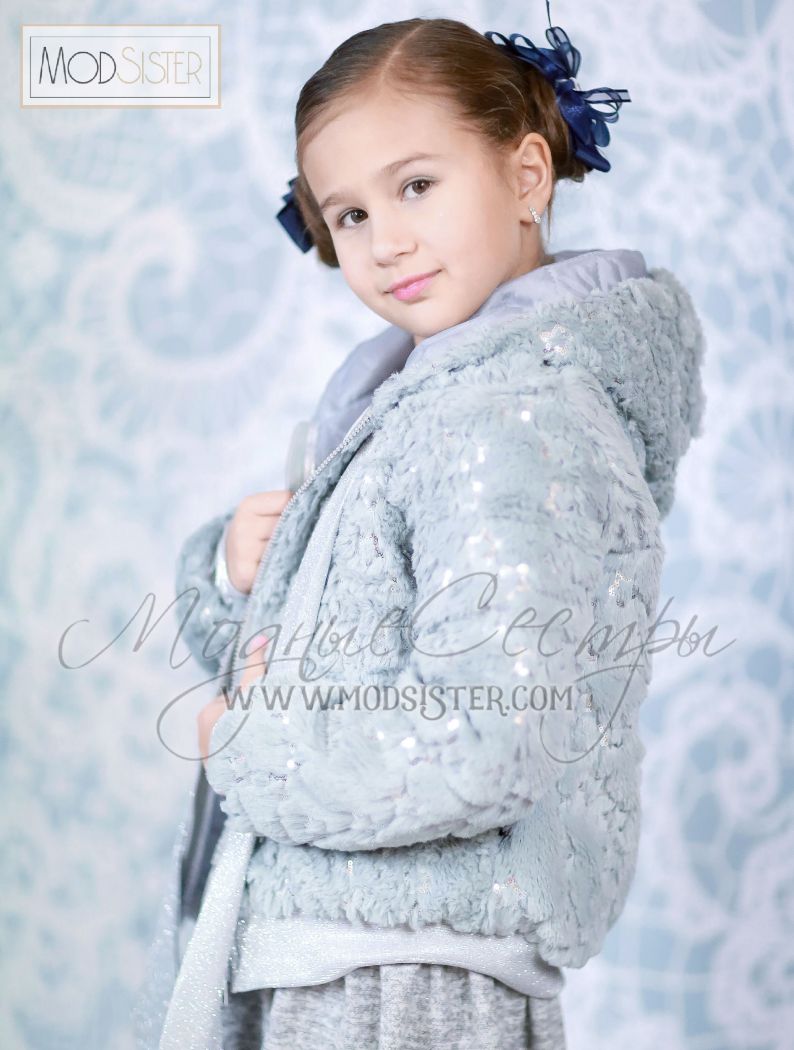 Куртка-бомбер для девочки из серого меха расшитого звездочками из пайеток.