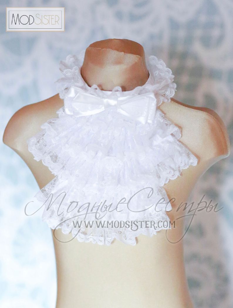 Жабо имеет воротник стойку, сзади завязывается на атласную ленту.