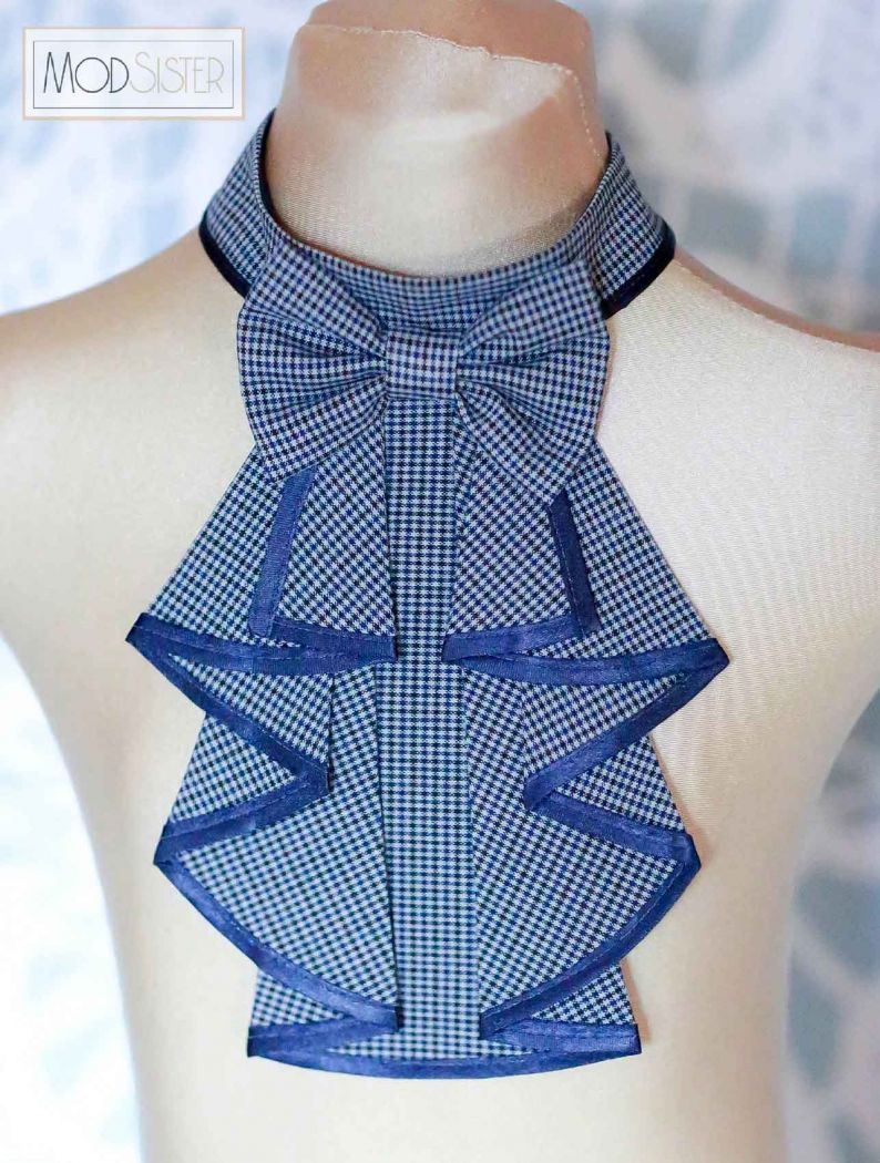 Жабо имеет воротник стойку, сзади завязывается на атласную ленту.