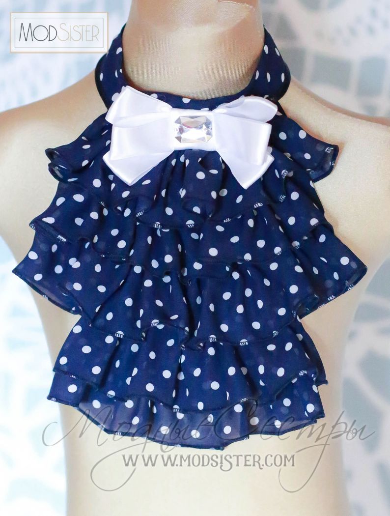 Жабо имеет воротник стойку, сзади завязывается на атласную ленту.